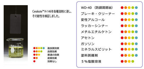 Cerakote®の乾燥過程で、表面に耐溶剤薬品性質が構成し始めます。この表はその中の1部の試験結果です。 |